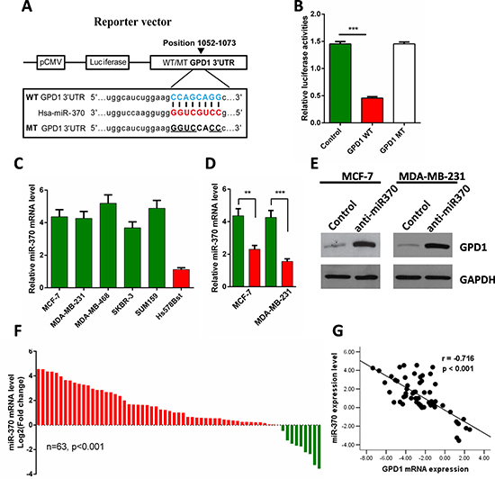 Figure 8: GPD1 is a direct target of miR-370. (A) Diagrammatic representation of miR-370 and its putative binding sequence in the 3′-UTR of GPD1 and the luciferase reporter plasmids with WT and MT GPD1 3′-UTRs. (B) Relative luciferase activity in MCF-7 cells after transfection with WT or MT GPD1 3′-UTR plasmid and co-transfection with miR-370 inhibitors. (C) The relative miR-370 mRNA levels in MCF-7, MDA-MB-231, MDA-MB-468, SKBR-3, SUM159 and normal breast cells (Hs-578Bst). (D–E) miR-370 inhibitors facilitated the expression of GPD1 both at the mRNA (D) and protein level (E) in MCF-7 and MDA-MB-231 cells. GAPDH was used as a control. (F) qRT-PCR analysis of miR-370 mRNA expression in 63 pairs of human breast cancer tissues and their corresponding adjacent normal tissues. miR-370 expression was normalized to U6 snRNA expression in each sample. (G) Inverse correlation between miR-370 and GPD1 expression in human breast cancer tissues. Data are presented as the mean ± SD. Two-tailed Student’s t-test was used. *p < 0.05, **p < 0.01, ***p < 0.001.