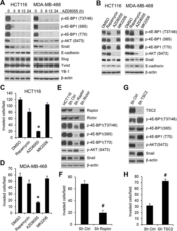 Figure 3: mTORC1 plays a critical role in the regulation of Snail expression and cancer cell motility. (A) HCT116 or MDA-MB-468 cells were treated with 500 nM AZD8055 for the indicated times. Cell lysates were immunoblotted with the indicated antibodies. (B) HCT116 or MDA-MB-468 cells were treated with 50 nM rapamycin. 500 nM AZD8055, 1 µM MK2206 or dimethyl sulfoxide (DMSO) as control for 12 h. Cell lysates were immunoblotted with the indicated antibodies. (C, D) Transwell invasion analysis of HCT116 and MDA-MB-468 cells in the presence of the drugs as indicated in (B) for 30 h (C) and 24 h (D), respectively. The results represent the mean number of invaded cells per field ± S.E.M. (n=3). * P < 0.03 for AZD8055 versus DMSO control, rapamycin or MK2206. (E) HCT116 cells alone or with stable expression of Ctrl shRNA, raptor shRNA or rictor shRNA were immunoblotted with the indicated antibodies. (F) Transwell invasion analysis of HCT116 cells with stable expression of Ctrl shRNA or raptor shRNA over 30 h. (G) Immunoblot analysis of HCT116 cells with stable expression of Ctrl shRNA or TSC2 shRNA. (H) Transwell invasion analysis of HCT116 cells with stable expression of Ctrl shRNA or TSC2 shRNA over 30 h. The results (F, H) represent the mean number of invaded cells per field ± S.E.M. (n=3). # P < 0.03 for Sh raptor or Sh TSC2 versus Sh Ctrl.