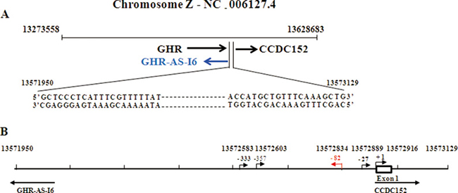 Figure 1: Genomic organization of the GHR-AS-I6 and CCDC152. (A) The location of the intervening region of GHR-AS-I6-CCDC152 in the chicken genome. (B) The potential transcript start sites of GHR-AS-I6-CCDC152 bidirectional promoter predicted by online software Fruitfly and PromoterScan. The 13572916 (+1) site was verified by 5′-RACE.
