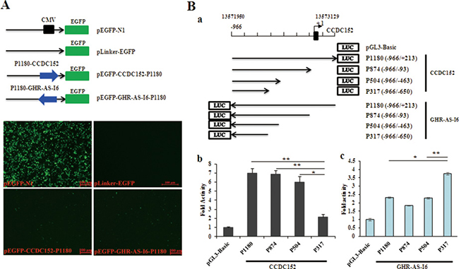 Figure 2: Identification of the proximal GHR-AS-I6-CCDC152 bidirectional promoter region. (A) The green fluorescent protein (GFP) detection of both CCDC152 and GHR-AS-I6 directional promoter region in LMH cells transfected with positive control pEGFP-N1, and negative control pLinker-EGFP (without CMV promoter) (40 × magnification). (B) The upper panel shows a schematic diagram of the luciferase reporter constructs containing the indicated genomic fragments of this GHR-AS-I6-CCDC152 pair. Positions relative to the major transcriptional initiation site of CCDC152 (+1) are indicated. LMH cells were transiently co-transfected, in triplicate, in 24-well culture plates with the indicated luciferase reporter constructs together with the Renilla luciferase reporter plasmid (pRL-TK). Firefly and Renilla luciferase activities were measured 48 h after transfection. Data are shown as fold induction compared with the activity of cells transfected with the empty promoter-less pGL3-basic luciferase reporter vector alone. The results are shown as the mean ± S.E.M of triplicate experiments. Significance: *, ** indicate P < 0.05 and P < 0.01, respectively.