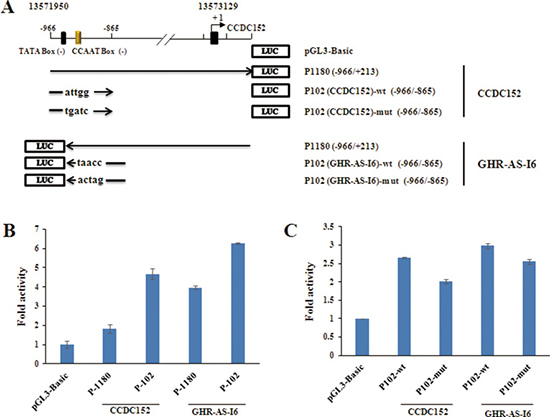 Figure 3: Identification of the core GHR-AS-I6-CCDC152 bidirectional promoter region. (A) The constructs of wild type (wt) and mutation core promoter region (mut) from -966 to -865 (P102). The position relative to the major transcriptional initiation site of CCDC152 (+1) are indicated. (B, C) Results of the reporter assay: LMH cells were transiently co-transfected with the indicated luciferase reporter constructs along with pRL-TK. Firefly and Renilla lusiferase activities were measured and analyzed 48 h after transfection, as described in Figure 2. The results are shown as the mean ± S.E.M of triplicate experiments. Significance: *, ** indicate P < 0.05 and P < 0.01, respectively.