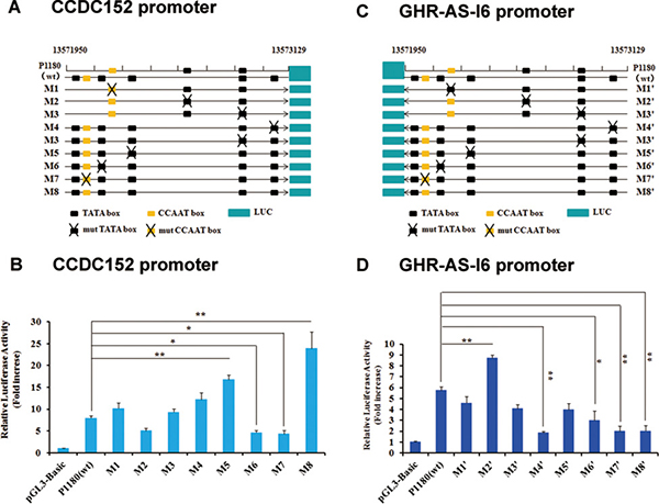 To see the transcription start sites of GHR-AS-I6 and CCDC152 and to clarify the intergenic region, we first analyzed CCDC152 using the online tools Jaspar and PROMO to predict the TATA box and transcriptional factor binding sites in the 1180 bp promoter region, respectively. We found that there was only one transcription start site (TSS) located at 13572834 for GHR-AS-I6 and 4 TSSs located at position 13572583, 13572603, 13572889 and 13572916 for CCDC152, indicating that there may be various 5′ un-translated regions for CCDC152 mRNA transcripts (Figure 1B).
