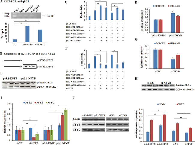 Figure 5: NFYB directly transactivates the transcription of both GHR-AS-I6 and CCDC152. (A) ChIP assay was used to detect the binding of NFYB and NFYC proteins to CCAAT box of the bidirectional promoter. (B) The constructs of overexpression of NFYB (pc3.1-NFYB) and control cells transfected with the empty vector (pc3.1-EGFP). Relative expression levels of CCDC152, GHR-AS-I6 and NFYA/B/C are shown after overexpressing NFYB and interfering NFYB (C, F, I). The bidirectional promoter activity has been changed after inducing NFYB (D) and interfering NFYB (G). The protein level of CCDC152 and NFYB were up-regulated and down-regulated after overexpressing NFYB and interfering NFYB (E, H, J), respectively. Significance: *, ** indicate P < 0.05 and P < 0.01, respectively.
