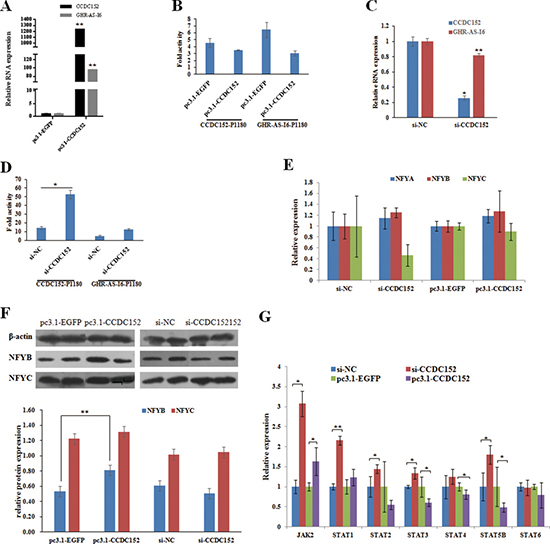 Figure 6: CCDC152 down-regulates the transcriptional activity of GHR-AS-I6-CCDC152 bidirectional promoter in LMH cells. The relative expression levels of GHR-AS-I6 (A, C), NFYA-C, JAK2 and STATs (E–G), and the bidirectional promoter activity (B, D) were changed by overexpressing and interfering CCDC152. Significance: *, ** indicate P < 0.05 and P < 0.01, respectively.