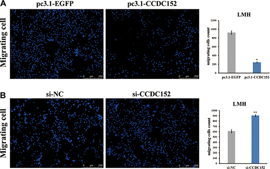 Figure 9: Transwell migration assays of LMH cells. (A, B) Shown in the left panel are representative microphotograph images of migrating LMH control cells (pc3.1-EGFP, si-NC) or cells transfected with stably introduced expression of CCDC152 (pc3.1-CCDC152) or interfering oligo of CCDC152 (si-CCDC152). Scale bar, 50 μm. Columns represent the mean of the counts of migrating cell numbers from at least 3 independent experiments, and the small vertical bars at the top of the columns represent S.E.M. Compared with the control, per Student’s t-test in both panels A and B, *P < 0.05 and **P < 0.01.