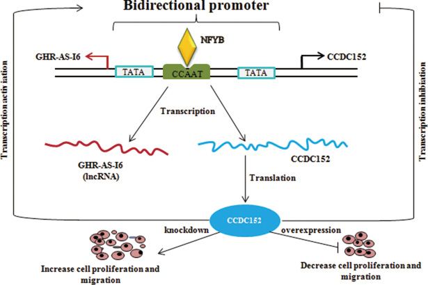 In summary, as shown in Figure 10, NFYB combined with NFYC could target the CCAAT box of the bidirectional promoter to trigger both GHR-AS-I6 and CCDC152 transcriptions. A high level of CCDC152 protein can not only suppress the bidirectional promoter activity, but also inhibit cell proliferation and migration; conversely, a low level of CCDC152 protein can increase bidirectional promoter activity, as well as promote cellular proliferation and migration by mediating JAK2/STAT3/5 signaling pathway.