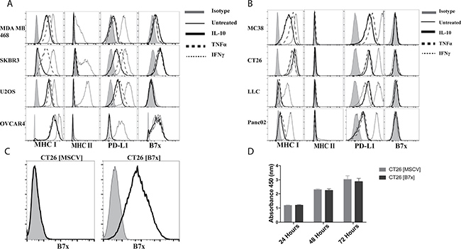 Figure 1: B7x expression is unaffected by cytokine stimulation and does not affect proliferation in vitro. (A) Human tumor cell lines and (B) murine tumor cell lines were stimulated with 50 ng/mL of IL-10, TNFα, or IFNγ for 48 hours and stained for surface expression of MHC I, MHC II, PD-L1, and B7x and evaluated by FACS. (C) CT26 transfected with an empty MSCV retrovirus CT26 [MSCV] and CT26 transfected with a MSCV retrovirus encoding murine B7x, CT26 [B7x] were stained for B7x. (D) Comparison of proliferation between CT26 [MSCV] and CT26 [B7x] for 24, 48, and 72 hours with CCK-8 pooled from two independent experiments. Error bars represent SEM.