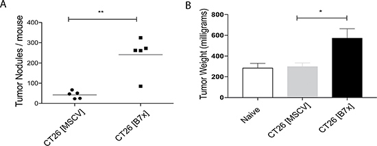 Figure 2: Tumor-expressed B7x increases pulmonary metastases. (A) Quantification of lung metastases at day 17 following i.v. injection of CT26 [MSCV] or CT26 [B7x]. (B) Measurement of tumor weight of individual naïve, CT26 [MSCV], or CT26 [B7x] tumor bearing lungs at day 17. Data are representative of two separate experiments. *p < 0.05, **p < 0.01. Error bars represent SEM.