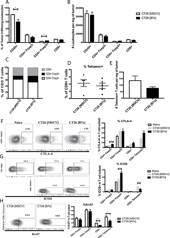 Though there was not a significant difference in the percentages of CD4 Teff (CD4+Foxp3-), when assessing the phenotypic properties of these cells it was found that cells in the CT26 [B7x] group expressed much higher levels of the co-inhibitory molecule CTLA-4 (Figure 3F). Analysis of CT26-specific tetramer positive CD8+ T cells also showed no significant changes in percentages and total numbers of this subset between both groups of mice, though there was a trend for a decrease (Figure 3D and 3E). However, it was notable to observe that the tetramer positive cells in the CT26 [B7x] group had significantly lower levels of co-stimulatory ICOS expression and were proliferating at a much slower rate as indicated by Ki-67 (Figure 3G–3H). Furthermore, it was also interesting to observe that Tregs in the CT26 [B7x] group expressed much higher levels of ICOS expression compared to CT26 [MSCV] control mice (Figure 3G), supporting recent literature suggesting that ICOS+ Tregs are more suppressive and predict lower overall survival [32].