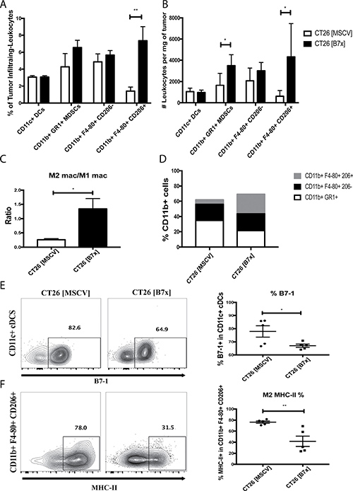 Myeloid cells in the tumor microenvironment have proven to be critical mediators of tumor development; therefore we attempted to elucidate the composition and functional characteristics in several of these subsets in response to tumor-expressed B7x. To evaluate the impact of B7x on the intratumoral composition of these subsets we assessed percentages and counted the absolute numbers of CD11c+ conventional dendritic cells (cDCs), CD11b+ GR1+ myeloid derived suppressor cells (MDSCs), CD11b+ F4-80+ CD206- M1 macrophages, and CD11b+ F4-80+ CD206+ M2 tumor associated macrophages (TAMs) and normalized these numbers by the tumor weight. We found that the composition of anti-tumoral cDCs and M1 macrophages were unaffected by tumor-expressed B7x between both groups of mice (Figure 4A–4B). However, when we evaluated pro-tumoral MDSCs and M2 TAMs, we observed a significant increase in the densities of these populations in the CT26 [B7x] group compared to CT26 [MSCV] controls (Figure 4B). This approximate seven-fold increase in TAMs as a result of B7x expression led to a five-fold increase in the M2 TAMs/M1 macrophage ratio, resulting in the greatest change in composition among the myeloid subset (Figure 4C–4D).