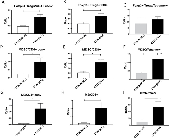 Figure 5: Tumor-expressed B7x generates highly immunosuppressive tumor microenvironment. (A–I) Ratios of Foxp3+ Tregs, MDSCs, and M2 TAMs to CD4+conv, CD8+ T cells, and CD8+ Tetramer+ T cells were calculated from cell numbers isolated from tumor bearing lungs of CT26 [MSCV] or CT26 [B7x] 17 days following i.v. tumor injection. All data is representative from three independent experiments. *p < 0.05, ***p < .001. Error bars represent SEM.