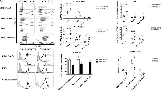 Given the overwhelming numbers of immunosuppressive cells in the context of our experimental metastasis tumor model, particularly in the presence of B7x, we further investigated the effects of CT26 [B7x] on the function of TILs when compared to their CT26 [MSCV] counterparts. T cell exhaustion is a state of dysfunction with a loss of effector function marked by an increase in PD-1 and Tim3 expression observed in the context of chronic infection and cancer [33]. So we examined the expression of these two surface markers on TILs to determine the role B7x may have in influencing this exhaustive state. Though we didn’t see a change in the co-expression of PD-1 and Tim3 on CD4eff T cells, there was a trend for an increase in the expression of PD-1+ alone and a significant increase in Tim3+ alone expression in the CT26 [B7x] group compared to the control group (Figure 6A). However, when we looked at CD8+ Tetramer+ T cells we did observe a three-fold increase in PD-1+ Tim3+ co-expression in the CT26 [B7x] group (Figure 6A) suggesting that B7x may play a role in the development of exhausted antigen-specific T cells. Interestingly, this approximate same three-fold increase in T cell exhaustion observed in CT26 specific CD8+ Tetramer+ T cells, was also observed in Tregs (Figure 6A) further supporting the capacity of B7x to contribute to T cell exhaustion.