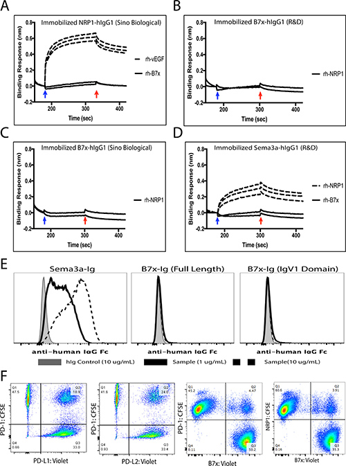 Figure 7: B7x does not directly interact with Neuropilin-1. (A) Human NRP1-hIgG1 (Sino Biological) was immobilized on sensors. Recombinant human vEGF (Peprotech) from concentrations of 0.025 mg/mL, 0.05 mg/mL and 0.1 mg/mL were challenged. The responses of vEGF were concentration dependent (dashed lines). Recombinant human B7x (R&D) was not responsive even at the concentrations of 0.25 mg/mL and 0.5 mg/mL (solid curve). (B) Human B7x-hIgG1 (R&D) was immobilized and recombinant human NRP1 (R&D) at the concentrations of 0.25 mg/mL and 0.5 mg/mL were challenged. (C) Human B7x-hIgG1 (Sino Bilogical) was immobilized and recombinant human NRP1 (R&D) at the concentrations of 0.25 mg/mL and 0.5 mg/mL were challenged. (D) Human Sema3a-hIgG1 (R&D) was immobilized on sensors. Rh-NRP1 (R&D) from concentrations of 0.025 mg/mL, 0.05 mg/mL and 0.1 mg/mL were challenged. The responses of vEGF were concentration dependent (dashed lines). Recombinant human B7x (R&D) was not responsive even at the concentrations of 0.25 mg/mL and 0.5 mg/mL (solid curve). The blue and red arrows indicate the starts of the association and dissociation, respectively. (E) 3T3 cells expressing Neuropilin-1 were incubated with either 10 ug/mL hIg control (shaded), 1 ug/mL (solid black line) or 10 ug/mL Sema3a-hIgG1, B7x-Ig, or B7x-Ig (IgV1 domain) protein (dashed black line) and then stained with APC-conjugated anti-human IgG Fc antibody to assess binding activity by FACS. (F) Incubation of labeled PD-1 with its ligands PD-L1 and PD-L2 resulted in 18% and 24% co-localization. Confirmed non-binding partners, PD-1 and B7x, resulted in approximately 4% non-specific binding, while NRP1 and B7x incubation led to approximately 3% co-localization. Data are representative of two separate experiments.