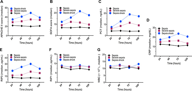 We collected peripheral blood samples from patients in different groups and then analyzed data within 24 hours start with the diagnosis of sepsis. Meanwhile, we determined the APACHE II score, SOFA score, CRP level, PCT level, creatinine level, white blood cell (WBC) count, platelet (PLT) count, prothrombin time (PT), RIPK3 level, and RIPK1 level. Besides, we recorded other clinical parameters of each patient as follow: sex, age, primary infection site, microorganism identified, the type of organ dysfunction, and the number of organs affected.