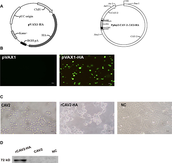 Figure 1: Construction and identification of the pVAX1-HA plasmid and recombined CAV2-HA. The hemagglutinin (HA) gene fragment of the canine influenza virus (A/canine/Guangdong/01/2006 (H3N2)) was inserted into the pVAX1 and ppoly2-CAV2-ΔE3 vectors (A). HA expression from the pVAX1-HA vector and rCAV2-HA was detected by indirect immunofluorescence and Western blot, respectively (B, D). In addition, MDCK cells exhibited grape-like gatherings indicative of an adenovirus infection after infection with rCAV2-HA for 24 h (C).