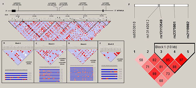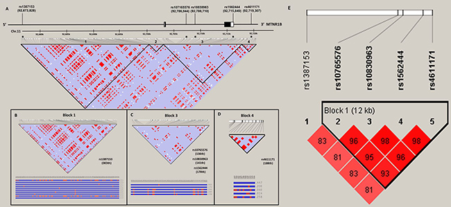 Genomic DNA was extracted using QIAamp DNA blood mini kits (Qiagen, Valencia, CA, USA). Allelic discriminations of five MTNR1A SNPs [ rs13140012 (Assay ID: C_31861431_10), rs6553010 (Assay ID: C_11782809_10), rs2119882 (Assay ID: C_16100974_10), rs13113549 (Assay ID: C_11791559_10), and rs2375801 (Assay ID: C_15785462_10)] and five MTNR1B SNPs [rs1387153 (Assay ID: C_1932612_10), rs1562444 (Assay ID: C_8369474_10), rs4611171 (Assay ID: C_3256853_20), rs10765576 (Assay ID: C_30851514_10), and rs10830963 (Assay ID: C_3256858_10)] were assessed by using the TaqMan assay with an ABI StepOne™ Real-Time PCR System (Applied Biosystems, Foster City, CA, USA), and analyzed with SDS version 3.0 software (Applied Biosystems, Foster City, CA, USA).