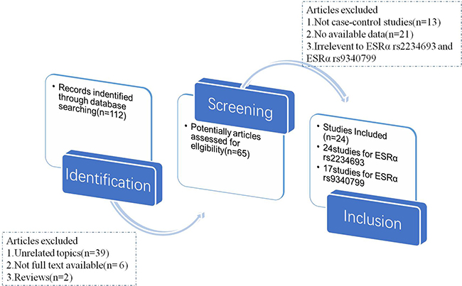 In the meta-analysis, totally 112 relevant articles were obtained under some fundamental restrictions. After filtering, 24 eligible articles [14–37] were finally selected on the basis of the inclusion and exclusion criteria. The flow chart of selecting articles process was presented in Figure 1. Therefore, there were 41 independent case-control studies in total, and the genotype distribution of control group was based on Handy-Weinberg. For ESRα rs9340799, there were 17 studies involving a total of 3960 PC cases and 4848 normal controls. For ESRα rs2234693, 24 studies (5477 PC cases and 10708 normal controls) were available, respectively. The main characteristics of these included studies were shown in Table 1.