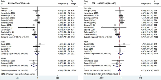 Although there are several studies on investigating the interactions between ESRα and PC among Asians, Europeans and Africans [7, 8], the inconsistency of findings exists. Remarkably, both sites of rs9340799 and rs2234693 have been widely studied in ESRα genetic polymorphisms [9–12], but ESRα rs9340799 or rs2234693 were independent of PC susceptibility because of quality and quantity limitations. The meta-analysis of ESRα rs9340799 and rs2234693 was firstly conducted by Ding [10] in 2012, indicating that rs9340799, not rs2234693, confered an elevated risk of PC. Gu’s study [11] demonstrated that there was no significant difference between 4,884 case groups and 10,134 control groups in rs2234693 regardless of allele or other models (allele model, OR = 0.98; 95 % CI, 0.88–1.08; P = 0.685; dominant model, OR = 0.98; 95 % CI, 0.89–1.07; P = 0.685; recessive model, OR = 0.96; 95 % CI, 0.81–1.14; P = 0.657; homozygous model, OR = 0.96; 95 % CI, 0.77–1.19; P = 0.708; heterozygous model, OR = 0.96; 95 % CI, 0.81–1.13; P = 0.708, respectively). On the other hand, G in rs9340799 may be related to PC susceptibility (allele model, OR= 1.09; 95 % CI, 1.03–1.17; P = 0.006; dominant model, OR = 1.17; 95 % CI, 1.07–1.29; P = 0.001; homozygous model, OR = 1.17; 95 % CI, 1.01–1.35; P = 0.040; respectively), especially in Africans (allele model, OR = 1.53; 95 % CI, 1.13–2.07; P = 0.006; dominant model, OR = 1.78; 95 % CI, 1.19–2.66; P = 0.005; homozygous model, OR = 2.04; 95 % CI, 1.00–4.14; P = 0.049, respectively). In contrast, such connections had not been indentified yet in Europeans or Asians, as reported in Ding’s publications. Fu’s research[9] presented that rs9340799 polymorphism was significantly associated with PC in overall populations (GG+GA vs. AA: P= 0.002; G vs. A: P = 0.004), Caucasians (GG+GA vs. AA: P = 0.008; G vs. A: P = 0.016) and Africans (GG+GA vs. AA: P= 0.005; G vs. A: P = 0.006), but not in Asians (GG+GA vs. AA: P = 0.462; G vs. A: P = 0.665). Another study [12] regarding 4,623 cases of PC patients pointed out that rs2234693 in overall populations was markedly involved in PC susceptibility (P < 0.05), and the polymorphism CC may increase the risks of PC. Moreover, ethnic subgroup analysis revealed that the site had a close correlation with Europeans (P < 0.05), but not with Asians or Africans (P > 0.05).