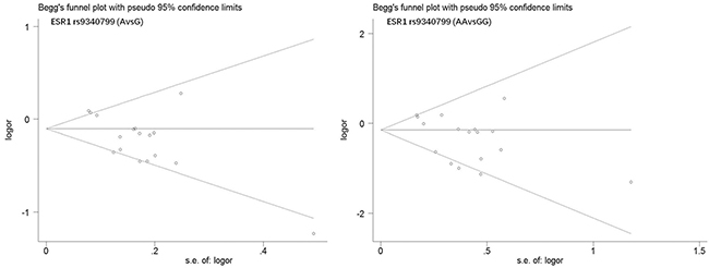Figure 4: Begg’s funnel plot of publication bias in meta-analysis of the association between ESR1 rs9340799 and prostate cancer risk(AvsG, AAvsGG).