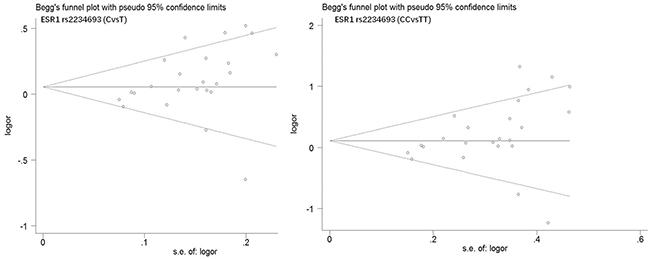 Figure 5: Begg’s funnel plot of publication bias in meta-analysis of the association between ESR1 rs2234693 and prostate cancer risk(CvsT, CCvsTT).