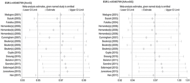 Figure 6: Sensitive analysis to assess the stability of meta-analysis between ESR1 rs9340799 and prostate cancer risk(AvsG, AAvsGG).