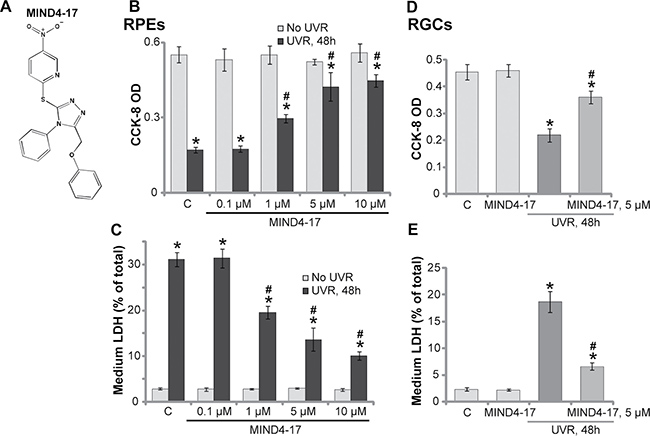 Figure 1: MIND4-17 protects retinal pigment epithelium (RPE) cells (RPEs) and retinal ganglion cells (RGCs) from UVR. The molecule structure of MIND4-17 was presented (A). ARPE-19 cells (B–C) or primary cultured human RGCs (D and E) were pretreated for 30 min with applied concentration of MIND4-17, cells were then subjected to UV radiation (UVR, UVA2 + B, 30 mJ/cm2) and were further cultured for 48 hours; Cell viability was tested by the CCK-8 assay (B and D); Cell death was examined by LDH release in the conditional medium (C and E). For each assay, n = 5. “C” stands for untreated control cells. *p < 0.05 vs. “C” cells. #p < 0.05 vs. “UVR” only cells. Experiments in this figure were repeated four times to insure consistency of results.