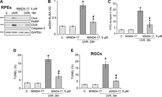 Figure 2: MIND4-17 inhibits UVR-induced apoptosis in RPEs and RGCs. ARPE-19 cells (A–D) or primary cultured human RGCs (E) were pretreated for 30 min with MIND4-17 (5 μM), cells were then subjected to UV radiation (UVR, UVA2 + B, 30 mJ/cm2) and were further cultured for applied time; Expressions of cleaved-PARP (“Clvd-PARP”) and cleaved-caspase-3 (“Clvd-Caspase-3”) were tested (A, GAPDH was shown as the loading control); Cell apoptosis was tested by the assays mentioned in the text (B–E). Annexin V ratio included both early (PI negative) and late (PI positive) apoptotic cells (C). For TUNEL assay, at least 200 cells in five random views (1×100 magnification) of each condition were analyzed to calculate TUNEL ratio (D and E). “C” stands for untreated control cells. *p < 0.05 vs. “C” cells. #p < 0.05 vs. “UVR” only cells. Experiments in this figure were repeated three times to insure consistency of results.