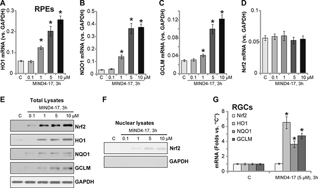 Figure 3: MIND4-17 activates Nrf2 signaling in retinal cells. ARPE-19 cells (A–F) or primary cultured human RGCs (G) were treated with applied concentration of MIND4-17, cells were further cultured for 3 hours; The real-time quantitative PCR (RT-qPCR) assay was employed to test mRNA expressions of listed genes (A–D and (G), GAPDH mRNA was tested as the internal control); Listed proteins in total cell lysates (E) and nuclear fraction lysates (F) were also tested by Western blotting assay (GAPDH was tested as the loading control, which was absent in the nuclear fractions). “C” stands for untreated control cells. *p < 0.05 vs. “C” cells. Experiments in this figure were repeated three times to insure consistency of results.