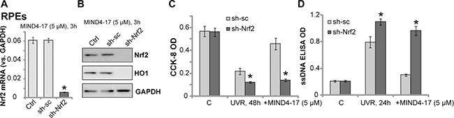 Figure 4: Nrf2 is required for MIND4-17-mediated retinal cytoprotection against UVR. Stable ARPE-19 cells, expressing scramble control shRNA (“sh-sc”) or Nrf2 shRNA (“sh-Nrf2”), were treated with MIND4-17 (5 μM) for 3 hours, Nrf2 mRNA (A) and listed proteins (B) were tested by RT-qPCR assay (GAPDH mRNA was tested as the internal control) and Western blotting assay (GAPDH was tested as the loading control), respectively; Cells were exposed UV radiation (UVR, UVA2 + B, 30 mJ/cm2) and cultured for applied time; Cell survival and apoptosis were tested by CCK-8 assay (C) and ssDNA ELISA assay (D), respectively. “Ctrl” stands for parental ARPE-19 cells (A and B). For each assay, n = 5. *p < 0.05 vs. “sh-sc” cells. Experiments in this figure were repeated three times to insure consistency of results.