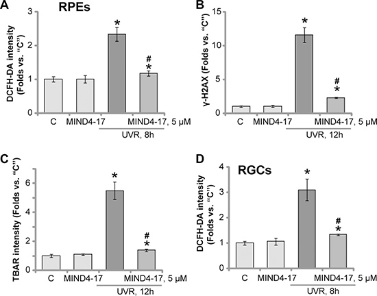 Figure 5: MIND4-17 efficiently attenuates UVR-induced oxidative stress in retinal cells. ARPE-19 cells (A–C) or primary cultured human RGCs (D) were pretreated for 30 min with MIND4-17 (5 μM), cells were then subjected to UV radiation (UVR, UVA2 + B, 30 mJ/cm2) and were further cultured for applied time; ROS production was tested by DCFH-DA intensity assay (A and D); DNA damages and lipid peroxidation were tested by γ-H2AX assay (B) and TBAR activity assay (C), respectively. “C” stands for untreated control cells. *p < 0.05 vs. “C” cells. #p < 0.05 vs. “UVR” only cells. Experiments in this figure were repeated three times to insure consistency of results.