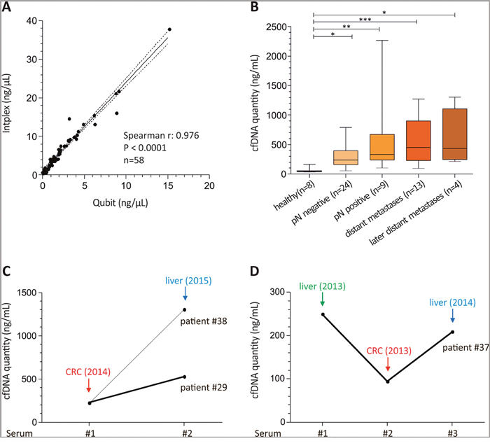 Figure 1: Intplex PCR shows abundant cfDNA levels in advanced colon cancer patients. (A) Spearman correlation of serum cfDNA amount in eight healthy and 50 serum samples from CRC patients revealed a strong association between Qubit and independent Intplex PCR measurement. (B) Box plot analysis indicated significant higher cfDNA concentrations in CRC patients compared to healthy individuals. (C) and (D) In patients with advanced cancer and additional distant metastasis six months (patient #29 and #38) and 13 months (patient #37) after primary cancer diagnosis cfDNA concentrations were higher at the time point of second distant metastasis. In case of patient #37 the first blood sample was drawn before surgery of the liver metastasis (serum 1) and the second 24 days later before surgery of the colorectal tumor (serum 2). Serum 3 was drawn at diagnosis of the liver metastasis 13 months later. Statistical analysis was performed using 1way ANOVA Kruskal-Wallis test to compare all groups where; *P < 0.05, **P < 0.01, ***P < 0.001.
