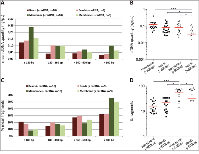 Figure 3: The use of the silica-based membrane system promotes the extraction of high molecular weight cfDNA fragments. (A) The silica-based membrane system revealed increased cfDNA yields mainly of small (≤ 180 bp) and high (> 600 bp) fragments compared to the magnetic beads system. (B) Scatter plot analysis revealed a significant 2.5-fold increased concentration of high molecular cfDNA fragments (> 600 bp) using the silica-based membrane system. In line, significant increased amounts of small cfDNA fragments (< 600 bp) compared to high molecular cfDNA fragments (> 600 bp) presented only with the magnetic beads system. (C) The silica-based membrane system showed reduced percentage (normalized to total measured fragments) of small cfDNA fragments compared to the magnetic beads system. (D) Scatter plot analysis indicated a significantly increased percentage of > 600 bp cfDNA fragments using the silica-based membrane system. Histograms in (A) and (C) present mean values of n=18 matched samples (extracted with carrier RNA) and n=20 matched samples (extracted without carrier RNA) from 10 CRC patients categorised in distinct fragment size groups. Red horizontal line in (B) and (D) shows mean of the mentioned groups. Statistical analysis was performed using 1way ANOVA Kruskal-Wallis test to compare all groups where; *P < 0.05, ***P < 0.001.