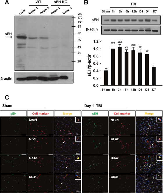 Figure 1: Upregulation of sEH protein expression in WT brains subjected to TBI. (A) Western blot analysis of mouse liver and brain tissues using anti-sEH antibody demonstrating a dominant band at ~62 kDa in the WT liver (lane 1) and WT brains (lanes 2 and 3), whereas no product was present in the sEH KO brains (lanes 4 and 5), confirming the specificity of the antibody. (B) Representative immunoblots of the sEH protein in the ipsilateral hemispheres of mice subjected to CCI injury or sham surgery. Bar graph of densitometric analysis of bands showing a significant increase in sEH protein level in the ipsilateral hemispheres of WT mice at 1 h, 3 h, 6 h, 12 h, 1 day and 4 days post-TBI, compared with the sham-operated brains. At 7 days after injury, the sEH protein level had decreased to the sham level. (C) Identification of sEH -positive cells at 1 day post-TBI or sham surgery in the peri-contussional area by double immunofluorescence labeling. sEH immunoreactivity is shown in green, and immunolabeling of NeuN (neurons), GFAP (astrocytes), OX42 (microglia), or CD31 (endothelial cells) is shown in red. Co-localization is shown by yellow labeling. Arrowheads indicate the location of higher magnification images. sEH localized to neurons, astrocytes, microglia, and endothelial cells. Sections were stained with DAPI (blue) to show all nuclei. Values are mean ± S.E.M; ##P < 0.01, and ###P < 0.001 vs. sham group (n = 5–6 mice / group, one-way ANOVA). The scale bar is 50 μm.