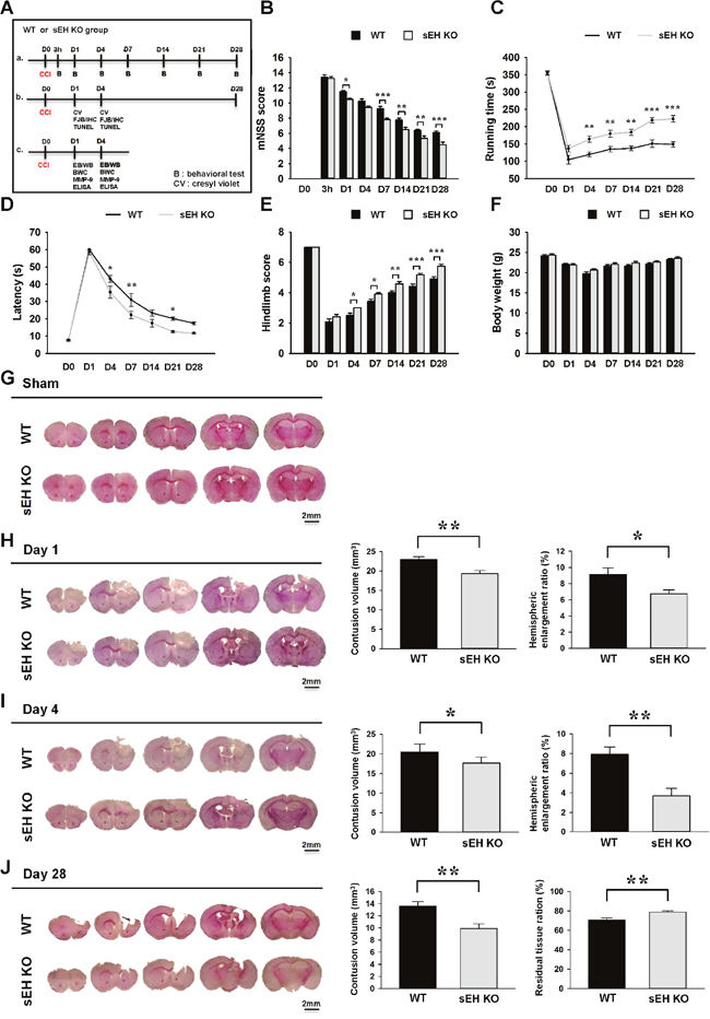 To assess whether sEH contributes to TBI, we first used a loss-of-function strategy to evaluate the effect of sEH deletion on behavioral recovery (Figures 2A-2E). The modified neurological severity score (mNSS) was used to measure global neurological deficits. At 3 h after injury, there was no difference in mNSS between WT and sEH KO mice, indicating that injury severity was initially equal (Figure 2B). The mNSS scores were significantly lower for sEH KO mice than for WT mice at 1, 7, 14, 21, and 28 days (all P < 0.05; Figure 2B). Rotarod and beam walking tests were employed to assess motor and coordination functions. Rotarod performance was significantly better in sEH KO mice compared with WT mice from 4 to 28 days (all p < 0.01; Figure 2C). In the beam-walking test, sEH KO mice required significantly less time to cross the beam at 4, 7 and 21 days post-injury (all P < 0.05; Figure 2D). The hindlimb scores were also significantly higher for sEH KO than for WT mice from 4 to 28 days (all P < 0.05; Figure 2E). However, there were no significant changes between the two groups in body weight (Figure 2F). Overall, these findings suggest that sEH deletion improves long-term neurobehavioral outcomes following CCI.