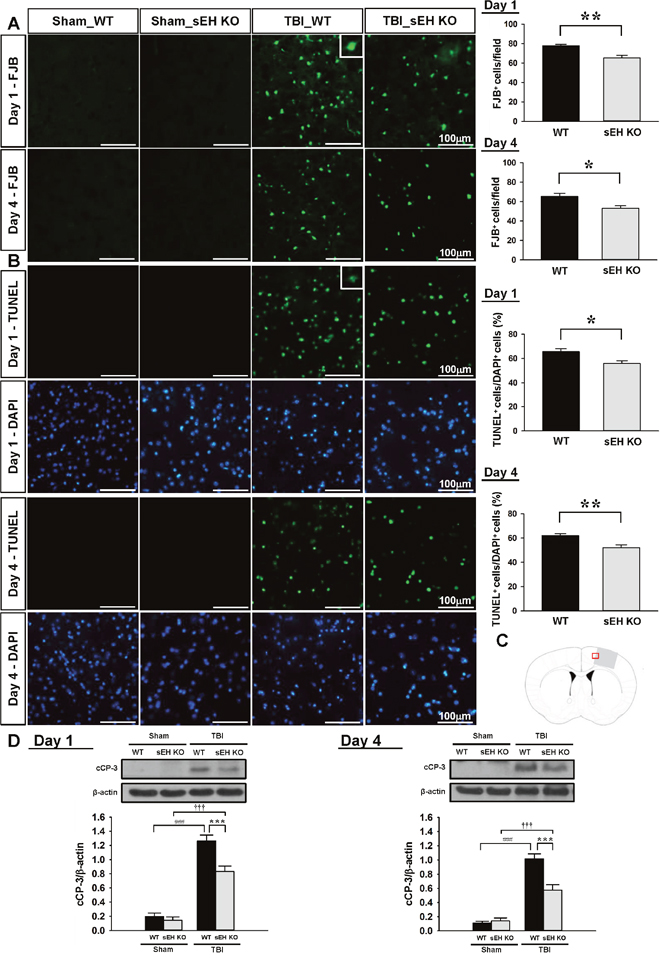 Figure 3: Deletion of sEH reduced neuronal damage and apoptotic cell death in mice after TBI. (A) Representative FJB, and (B) TUNEL (green) and DAPI-stained (blue) brain sections of WT and sEH KO mice at 1 and 4 days post-TBI. The inset is a representative FJB-positive or TUNEL-positive cell at higher magnification. Quantification analysis indicates that sEH KO mice had significantly fewer degenerating neurons and a lower percentage of TUNEL-positive cells than WT mice at both 1 and 4 days post-TBI. The total number of FJB-positive cells is expressed as the mean number per field of view (0.8 mm2). The percentage of TUNEL-positive cells is expressed as the percentage of nuclei that were stained by the TUNEL method/the total number of DAPI-stained nuclei. Sections were stained with DAPI (blue) to show all nuclei. (C) Brain atlas coronal brain section of a core injury region at 0.74 mm from the bregma. The red box indicates the the location of representative images. The scale bar is 100 μm. (D) Western blot analysis of cleaved caspase-3 in the ipsilateral hemisphere of WT and sEH KO mice at 1 and 4 days following sham surgery or TBI. Deletion ofsEH significantly decreased the cleaved caspase-3 level at both 1 and 4 days post-TBI. cCP-3: cleaved caspase-3. Values are mean ± S.E.M; ###, ††† P < 0.001 vs. sham group; *P < 0.05, **P < 0.01, ***P < 0.001 vs. WT group (n = 7 mice / group, Student’s t-test for histology and repeated measures two-way ANOVA for Western blots).