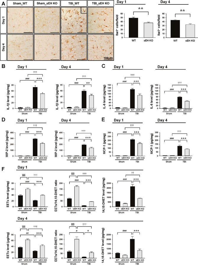 Figure 5: Deletion of sEH reduced microglial/macrophage activation and expression of inflammatory cytokines and chemokines and EET degradation. Representative (A) Iba1-stained images from WT and sEH KO mice in the contusion margin (see the red box in the brain atlas coronal brain section in Figure 3C) at 1 day and 4 days following sham surgery or TBI. Cell count analysis shows that sEH KO mice had significantly fewer Iba1-positive cells than WT in the cortical contusion margin at both 1 and 4 days post-TBI. The number of Iba1-positive cells is expressed as the mean number per field of view (0.8 mm2). The scale bar is 100 μm. Bar graphs demonstrating (B) IL-1β, (C) IL-6, (D) MIP-2, (E) MCP-1, (F) EET level, EET/14,15 DHET ratio and 14,15 DHET protein level, as assessed by ELISA in the ipsilateral cortices of WT and sEH KO mice at 1 day or 4 days following sham surgery or TBI. Deletion of sEH significantly attenuated IL-1β, IL-6, MIP-2, and MCP-1 protein levels compared with WT mice at 1 day and 4 days post-TBI. sEH KO mice exhibited significantly increased EETs level, elevated EET/ 14,15 DHET ratio and reduced 14,15 DHET level compared with WT mice at both 1 day and 4 days post-TBI. Values are mean ± S.E.M; † P < 0.05, ## P < 0.01, ###, ††† P < 0.001 vs. sham group; *P < 0.05, ***, §§§ P < 0.001 vs. WT group (n = 6–7 mice / group for cytokines and chemokines, and n = 4–5 mice / group for EETs and 14, 15 DHET, repeated measures two-way ANOVA).