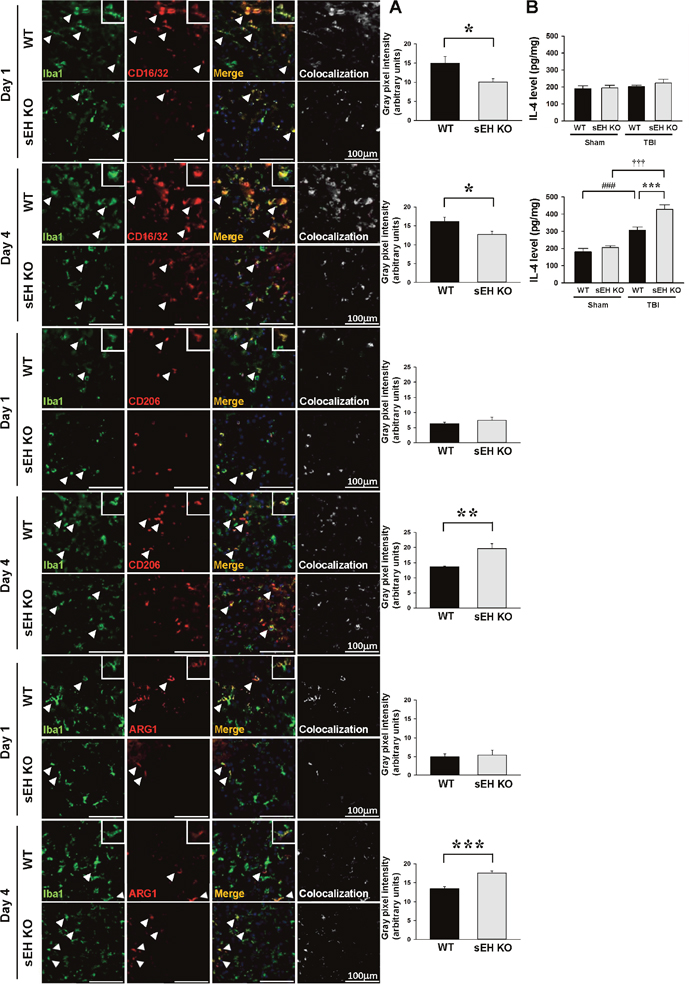 Figure 6: Deletion of sEH reduced proinflammatory microglia/macrophage activation and heightened anti-inflammatory microglia/macrophage response after TBI. (A) Representative double-immunofluorescence of CD16/32 (classical activation marker; red), CD206 or arginase 1 (ARG1, alternative activation markers; red) and Iba1 (green) in the contusion margin (see the red box in the brain atlas coronal brain section in Figure 3C) of WT and sEH KO mice at 1 day and 4 days following TBI. Arrowheads indicate the cells of colocalization. The inset images represent higher magnification of the boxed region in the corresponding images. The scale bar is 100 μm. The bar graph shows the degree of Iba1 and CD16/32, CD206 or arginase 1 colocalization in gray pixel intensity. Deletion of sEH resulted in a significant decrease of CD16/32-Iba1double-positive signal at 1 day and 4 days and an increase of CD206-Iba1 or arginase-1 double-positive signal at 4 days post-TBI. (B) Bar graphs of IL-4 protein level as assessed by ELISA in ipsilateral hemispheres of WT and sEH KO mice at 1 day and 4 days following sham surgery or TBI. Deletion of sEH caused a significant elevation of IL-4 level at 4 day. Values are mean ± S.E.M; ###, ††† P < 0.001 vs. sham group; *P < 0.05, ** P < 0.01, ***P < 0.001 vs. WT group (n = 5 mice / group for CD16/32, CD 206 or arginase 1 and Iba1 double stainings, Student’s t-test; n = 6 mice / group for IL-4 ELISA, repeated measures two-way ANOVA).