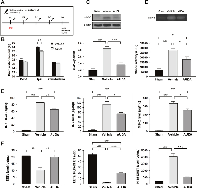 Figure 7: Intracerebroventricular administration of AUDA reduced brain edema, apoptosis, MMP-9 activity, and expression of inflammatory cytokines and chemokines and EET degradation after TBI. (A) Experimental design and animal groups classification. TBI: traumatic brain injury; BWC: brain water content; MMP-9: matrix metalloproteinase-9; WB: Western blots; ELISA: enzyme-linked immunosorbent assay. (B) AUDA significantly decreased brain water content in the ipsilateral hemisphere compared with the WT mice. Cont: contralateral cortex; Ipsi: ipsilateral cortex. (C) Western blot analysis of cleaved caspase-3 and (D) MMP-9 activity in the ipsilateral hemisphere of sham-injured, vehicle-treated and AUDA-treated mice at 4 days following injury. AUDA treatment significantly decreased the cleaved caspase-3 level and MMP-9 activity at 4 days post-TBI. cCP-3: cleaved caspase-3. Bar graphs demonstrating (E) IL-1β, IL-6, MIP-2 levels and (F) EET level, EET/14,15 DHET ratio and 14,15 DHET protein level, as assessed by ELISA in the ipsilateral cortices of WT at 4 days following sham surgery or TBI. AUDA significantly attenuated IL-1β, IL-6, and MIP-2 protein levels compared with WT mice at 4 days post-injury. AUDA-treated mice exhibited significantly increased EETs level, elevated EET/ 14,15 DHET ratio, and reduced 14,15 DHET level compared with vehicle-treated mice at 4 days post-TBI. Values are mean ± S.E.M; #P < 0.05, ##P < 0.01, ###P < 0.001 vs. sham group; *P < 0.05, **P < 0.01, ***P < 0.001 vs. vehicle group (n = 7 mice / group for brain water content, n = 5-7 mice / group for Western blot analysis, MMP-9 activity, cytokines and chemokines, and n = 4 mice / group for EETs and 14, 15 DHET, one-way ANOVA).