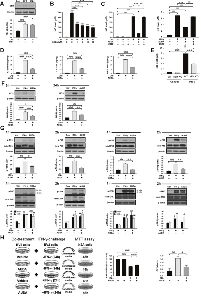 Figure 8: Pharmacological inhibition or genetic deletion of sEH inhibited LPS- or IFN-γ-induced inflammatory responses in cultured microglia. (A) In BV2 microglia, both LPS and IFN-γ treatment for 24 h induced a significant increase of sEH protein level. (B) In BV2 microglia, co-treatment of 1, 5, 10, or 50μM AUDA with LPS for 24h significantly attenuated LPS- induced release of NO from the supernatant of microglial cultures. In primary microglia, co-treatment of 10μM AUDA with (C) LPS or IFN-γ for 24 h significantly reduced LPS- or IFN-γ-induced release of NO from the supernatants of microglial cultures. The protective effect of AUDA on microglial activation was completely abolished by administration of the putative pan-EET receptor antagonist 14,15-EEZE (1μM) in both LPS- and IFN-γ-stimulated primary microglia. (D) Co-treatment of 10μM AUDA with LPS for 24 h significantly reduced LPS-induced release of IL-1β, IL-6 and MIP-2 from the supernatants of primary microglial cultures. (E) In primary mouse microglial cultures, deletion of sEH significantly attenuated IFN-γ-induced release of NO from the supernatant of microglial cultures. (F) Representative immunoblots and bar graphs show that co-treatment of 10μM AUDA with IFN-γ significantly reduced iNOS protein levels at 6 h and 24h. (G) Representative immunoblots and bar graphs show that co-treatment of 10μM AUDA with IFN-γ significantly reduced IFN-γ-induced P65 and P38 phosphorylation at 1 h and 2 h, but did not affect JNK or ERK phosphorylation in primary microglia. (H) Experimental scheme of neuronal survival in N2A cells in response to IFN-γ-treated BV2-conditioned media with or without AUDA pretreatment. BV2 microglia were incubated with IFN-γ in the absence (IFN-γ-CM) or presence of 10μM AUDA (IFN-γ-/AUDA-CM) for 24 h. Cell-free supernatant fractions were applied to N2A cells for 48 h to evaluate the changes in cell viability and cleaved caspase-3 level. Neuronal cell death increased after exposure to IFN-γ-treated conditioned microglial media; the effect was significantly reduced by microglia pretreatment with 10μM AUDA. Western blot analysis showed that AUDA significantly reduced the cleaved caspase-3 level compared with N2A cells treated with conditioned microglia media alone. cCP-3: cleaved caspase-3. Values are presented as mean ± S.E.M of four independent experiments. #P < 0.05, ##P < 0.01, ###, §§§P < 0.001 vs. normal control; *P < 0.05, **P < 0.01, ***P < 0.001 vs. LPS/IFN-γ stimulation alone or WT group (one way ANOVA for pharmacological experiments and two-way ANOVA for gene deletion experiment).
