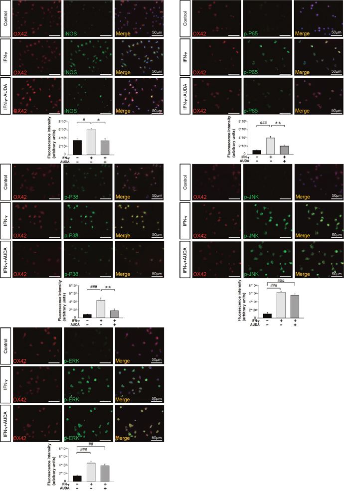 Figure 9: AUDA inhibited IFN-γ-induced iNOS expression and phosphorylation of P65 and P38 in primary microglia cultures. Immunolabeling of iNOS (green), phospho-P65 (green), phospho-P38 (green), phospho-JNK (green), phospho-ERK p44/42 (green) with OX42 (red), a marker of microglia. Co-localization is shown by yellow labeling. Cells were stained with DAPI (blue) to show all nuclei. Bar graphs show thatco-treatment of 10μM AUDA with IFN-γ significantly reduced immunoreactivity for iNOS at 24 h, phospho-P65, phospho-P38 at 2 h but had no effect on phospho-JNK or phospho-ERK p44/42 immunoreactivity at 2 h. Values are presented as mean ± S.E.M of four independent experiments. #P < 0.05, ##P < 0.01, ###P < 0.001 vs. normal control; *P < 0.05, **P < 0.01 vs. IFN-γ stimulation alone (one-way ANOVA). The scale bar is 50 μm.