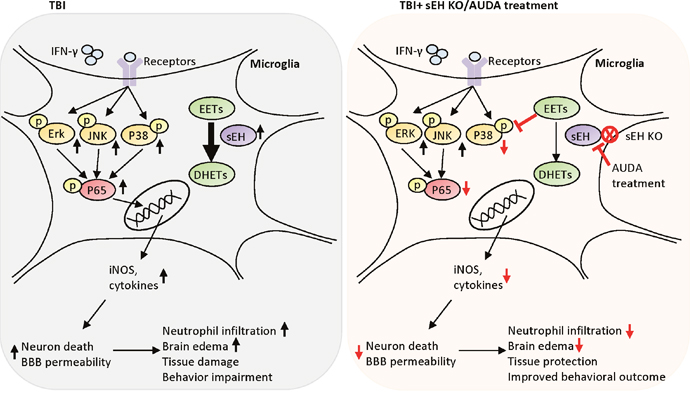 In summary, our study shows that gene deletion or pharmacological inhibition of sEH protects against TBI (Figure 10). This neuroprotective effect is at least in part mediated by inhibition of P38 and NF-κB signaling in activated microglia, thereby suppressing the upregulation of inflammatory mediators. We conclude that sEH inhibition after TBI can reduce microglial activation to suppress inflammation and reduce subsequent neuronal death. Our findings suggest that sEH can be a potential therapeutic target to reduce brain damage and to improve functional outcome in survivors of TBI.