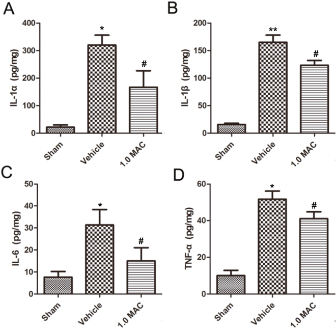 Figure 2: SF-PreCon significantly inhibits the secretion of inflammatory cytokines in the injured spinal cord tissues after tSCI. ELISA of cytokines IL-1α (A), IL-1β (B), IL-6 (C), and TNF-α (D) in tSCI rats with or without 1.0 MAC SF-PreCon. Data are mean ± SEM; * P < 0.05 versus the Sham group; # P < 0.05 versus the Vehicle group; unpaired two-tailed Student’s t-test. n = 5 per group.
