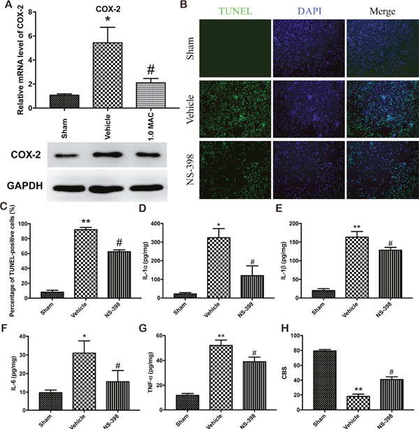 Figure 3: SF-PreCon attenuates the secondary injury after tSCI through the inhibition of COX-2 expression. (A) Real-time PCR and western blotting assay for COX-2 mRNA and protein levels in tSCI rats with or without 1.0 MAC SF-PreCon. Data are mean ± SEM; * P < 0.05 versus the Sham group; # P < 0.05 versus the Vehicle group; unpaired two-tailed Student’s t-test. n = 5 per group. (B) Representative slides of TUNEL staining of the spinal cord sections with or without NS-398 treatment. Magnification = ×100. (C) Percentage of TUNEL-positive cell in B were calculated. Data are mean ± SEM; ** P < 0.01 versus the Sham group; # P < 0.05 versus the Vehicle group; unpaired two-tailed Student’s t-test. n = 5 per group. (D-G) ELISA of cytokines IL-1α (D), IL-1β (E), IL-6 (F), and TNF-α (G) in tSCI rats with or without NS-398 treatment. Data are mean ± SEM; * P < 0.05 or ** P < 0.01 versus the Sham group; # P < 0.05 versus the Vehicle group; unpaired two-tailed Student’s t-test. n = 5 per group. (H) The mean CBS score in tSCI rats was improved by NS-398 treatment. Data are mean ± SEM; ** P < 0.05 versus the Sham group; # P < 0.05 versus the Vehicle group; unpaired two-tailed Student’s t-test. n = 5 per group.