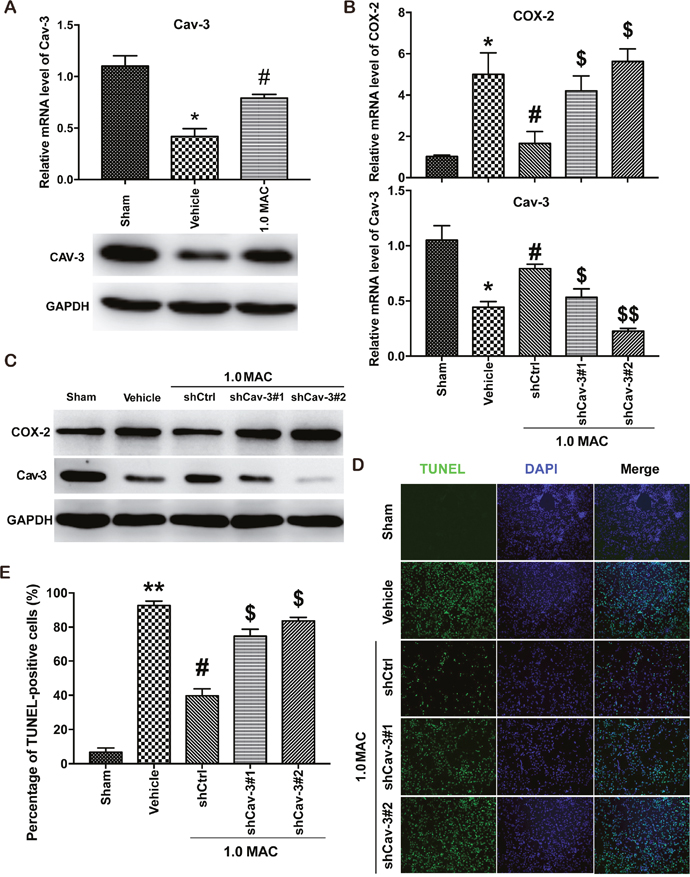 Figure 4: SF-PreCon attenuates tSCI through Cav-3 dependent COX-2 inhibition. (A) Real-time PCR and western blotting assay for Cav-3 mRNA and protein levels in tSCI rats with or without 1.0 MAC SF-PreCon. Data are mean ± SEM; * P < 0.05 versus the Sham group; # P < 0.05 versus the Vehicle group; unpaired two-tailed Student’s t-test. n = 5 per group. (B) Real-time PCR assay for COX-2 and Cav-3 mRNA levels after Cav-3 knockdown with 1.0 MAC SF-PreCon. Data are mean ± SEM; * P < 0.05 versus the Sham group; # P < 0.05 versus the Vehicle group; $ P < 0.05 or $$ P < 0.01 versus the shCtrl group; unpaired two-tailed Student’s t-test. n = 5 per group. (C) Western Blotting assay for COX-2 and Cav-3 protein levels after Cav-3 knockdown with 1.0 MAC SF-PreCon. (D) Representative slides of TUNEL staining of the spinal cord sections after Cav-3 knockdown with 1.0 MAC SF-PreCon. Magnification = ×100. (E) Percentage of TUNEL-positive cell in D were calculated. Data are mean ± SEM; ** P < 0.01 versus the Sham group; # P < 0.05 versus the Vehicle group; $ P < 0.05 versus the shCtrl group; unpaired two-tailed Student’s t-test. n = 5 per group.