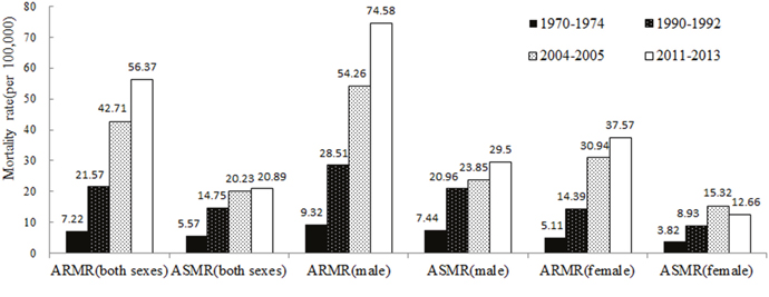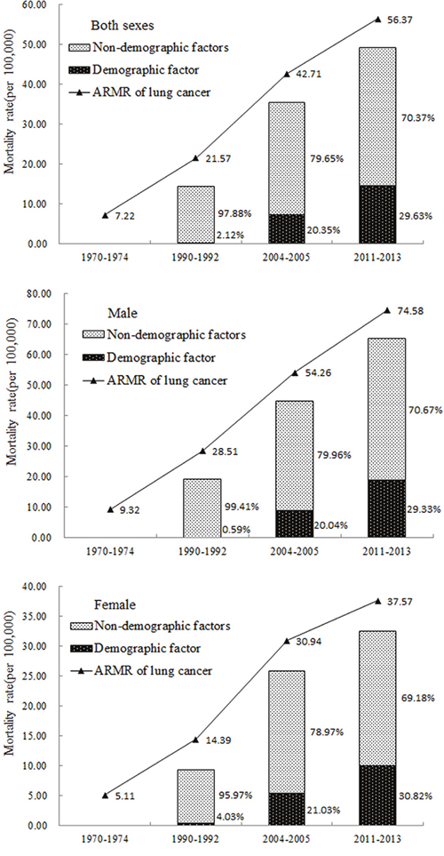 To reduce mortality variations in small populations and areas, an average reported mortality rate (ARMR) of lung cancer was calculated for each county (district) as a ratio of total deaths over corresponding population during the periods of 1970-1974, 1990-1992, 2004-2005 and 2011-2013. An age standardized mortality rate (ASMR) was calculated using the Chinese population in 1964. A difference decomposing method was applied to estimate the contribution of demographic and non-demographic factors for the change in ARMR in different eras [54]. The detailed formulae for the difference decomposing method can be found in previous publication [20]. The following formulae can help to better understand the method used.