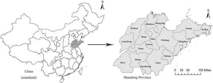 Figure 3: Location of Shandong Province, China. ArcGis 10.2 (http://www.esri.com/software/arcgis/arcgisonline).