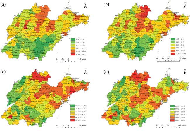 Figure 4: Spatial distribution of lung cancer mortality at the county level in Shandong Province during 1970-1974 and 2011-2013. (a) 1970-1974(ARMR), (b) 1970-1974(ASMR), (c) 2011-2013(ARMR), (d) 2011-2013(ASMR) ArcGis 10.2 (http://www.esri.com/software/arcgis/arcgisonline).