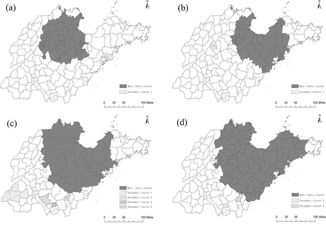 In this study, some secondary clusters were detected in the southwestern region of Shandong Province for the period of 2011-2013. These areas were low in lung cancer mortality previously and are mainly agricultural counties with a low level of industrialization. This is a new discovery, which will be studied further in the future.