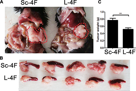 We first evaluated whether L-4F might exhibit suppressive effects on pancreatic cancer development in a mouse model. To accomplish this, C57BL/6 mice were implanted with H7 pancreatic cancer cells through direct injection into the pancreas. L-4F (10 mg/kg) or Sc-4F (10 mg/kg), a control peptide, was administered. As shown in Figure 1A–1C, compared with tumors in Sc-4F-treated mice, L-4F treatment significantly reduced both tumor size (Figure 1A, 1B) and tumor weight (0.77 g vs 0.52 g, P<0.01) (Figure 1C).