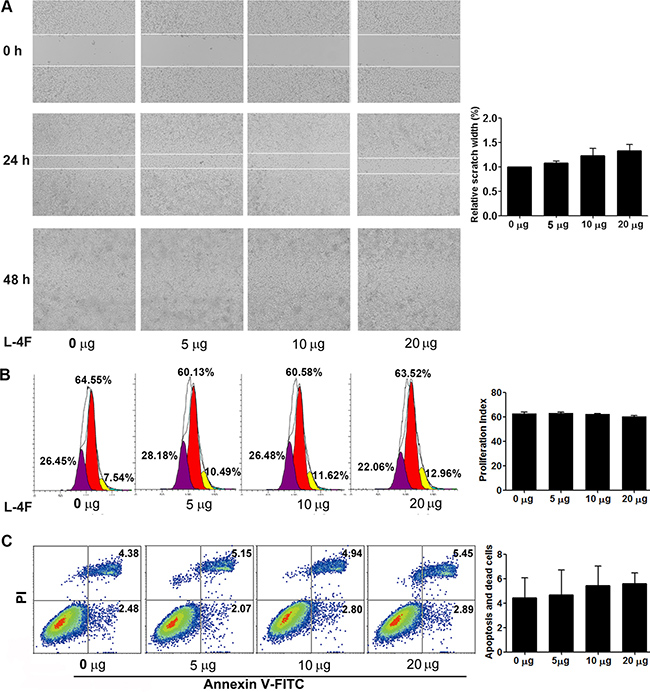 H7 cells were treated with vehicle or the indicated concentration of L-4F (5, 10, or 20 μg/mL) and submitted to a wound healing assay. Wound width was photographed using light microscopy at 0, 24 and 48 h after scraping. As shown in Figure 2A, there were no clear differences in wound healing for the duration of L-4F treatment. As shown in Figure 2B, the proliferative index (PI) of the L-4F-treated cells was not obviously reduced compared to the untreated or low dose-treated cells (PI = 62.74, 63.17, 62.28, and 60.22 for 0, 5, 10, and 20 μg/mL, respectively, NS). In addition, compared with the untreated cells, the populations of early apoptotic, necrotic, and late apoptotic cells were not obviously changed in the L-4F-treated cells (4.43%, 4.68%, 5.44% and 5.88%, for 0, 5, 10, and 20 μg/mL, respectively, NS) (Figure 2C).